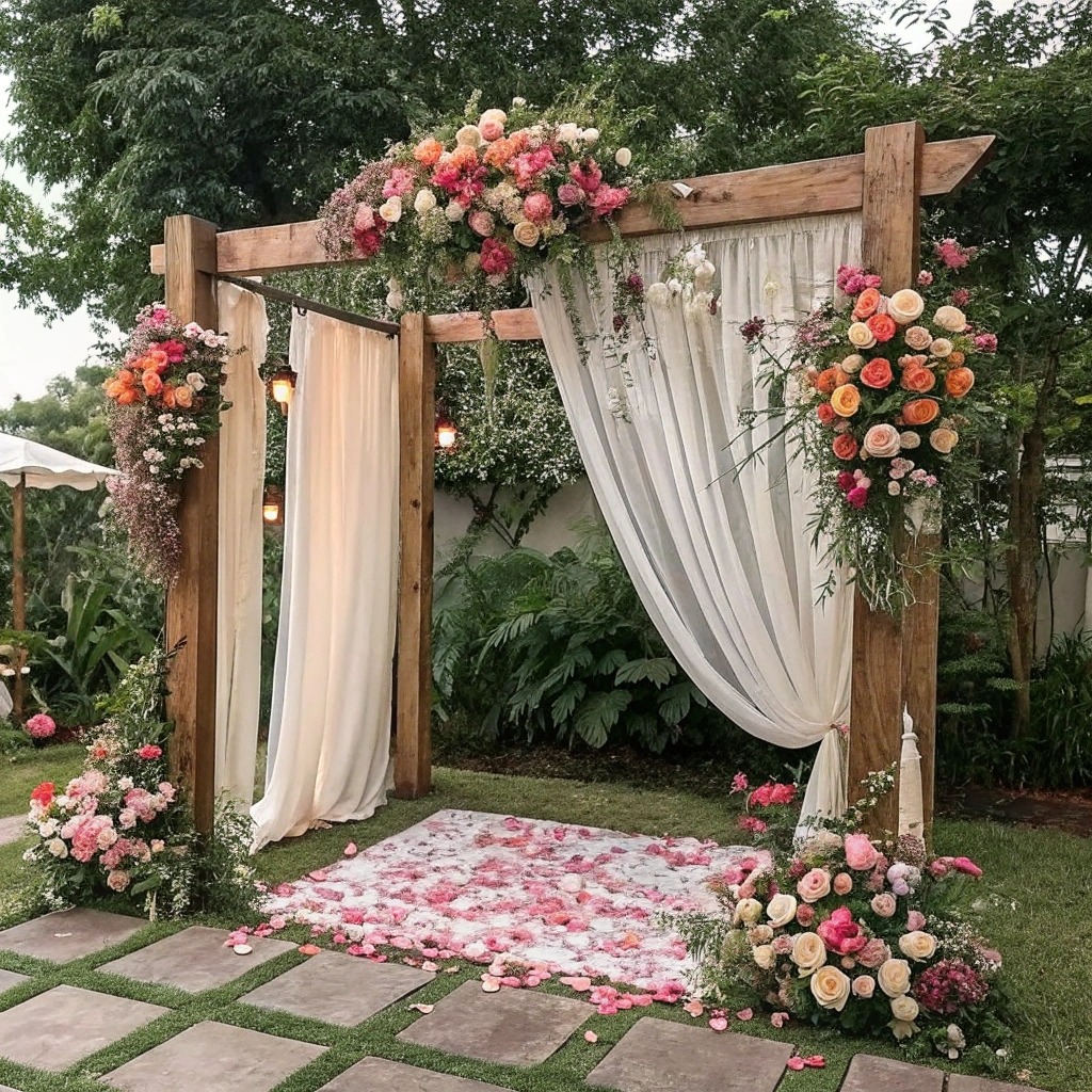 Квіткове оформлення фотозони на весілля часто включає троянди, півонії, дельфініуми та зелень — кожен варіант створює свій неповторний настрій. Щоб побачити приклади готових арок, перегляньте каталог оформлення.