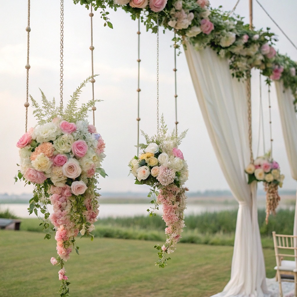 Підвісні композиції — це новий тренд у флористичному оформленні весіль. Вони додають об’єму, динаміки та витонченості, особливо якщо оформлення весільної фотозони квітами потребує нестандартних рішень.