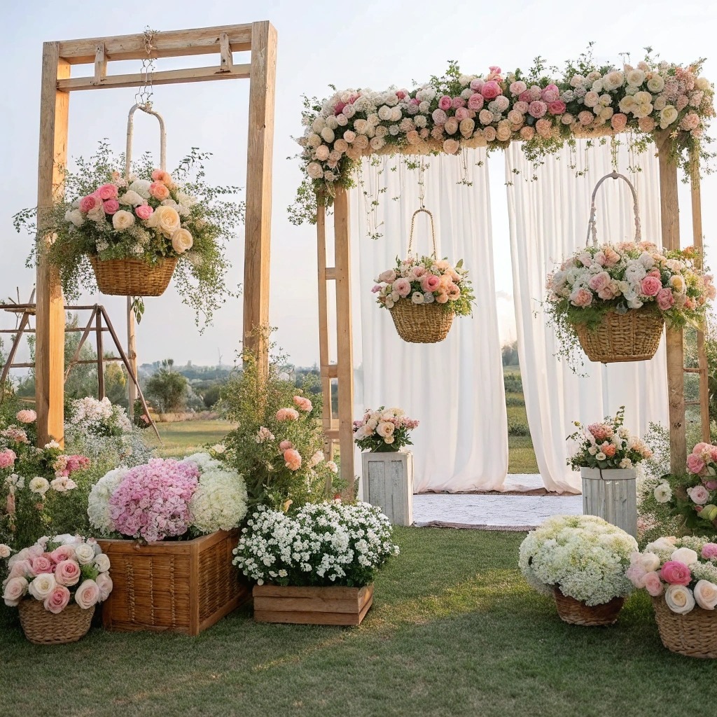 Для тих, хто мріє про атмосферу затишку та простоти, ідеально підійде рустикальна фотозона з квітів на весілля. Тут домінують польові квіти, сухоцвіти, дерев’яні елементи, природна текстура і м’яка кольорова палітра. Весільні фотозони з квітів у такому стилі чудово виглядають на природі, біля лісу або в лавандовому полі.