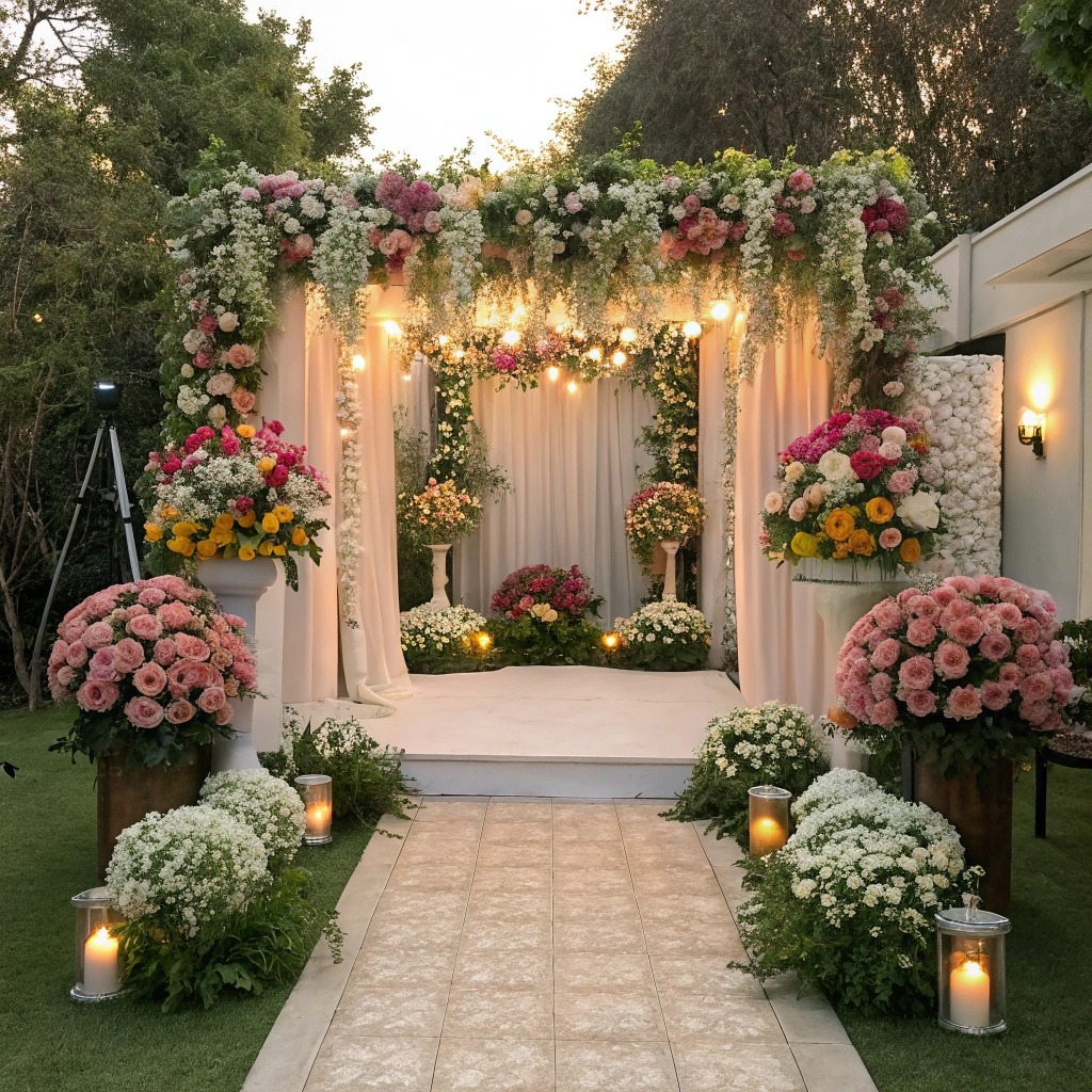 Альтернатива — фотозона з поєднанням живих і стабілізованих або шовкових квітів: це дозволяє зберегти свіжість композиції візуально на весь день. Також можна замовити повністю штучну квіткову фотозону — вона не втрачає вигляд навіть у спеку і забезпечує бездоганний стильний фон до кінця вечора.