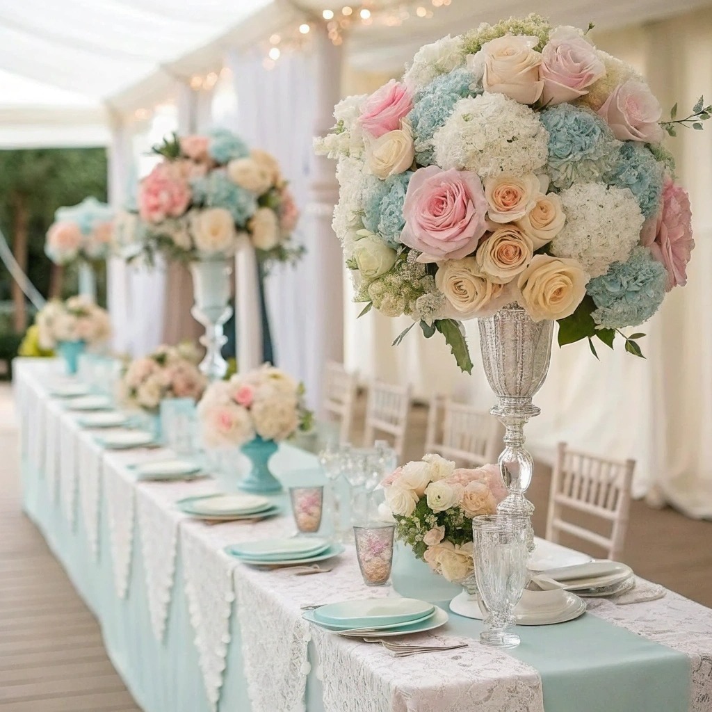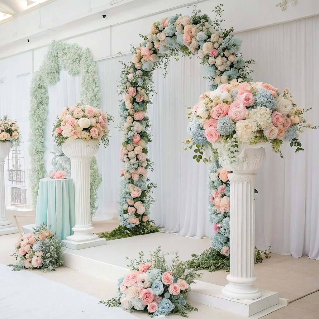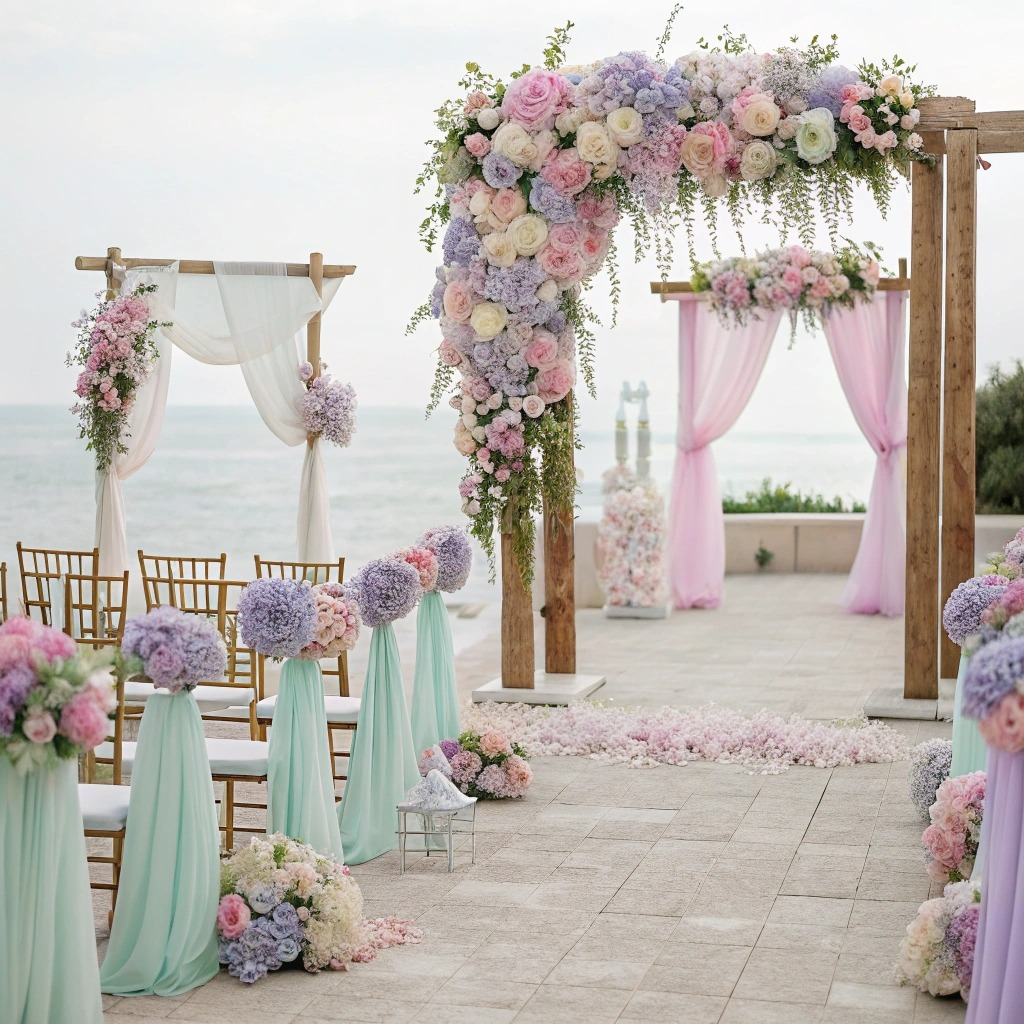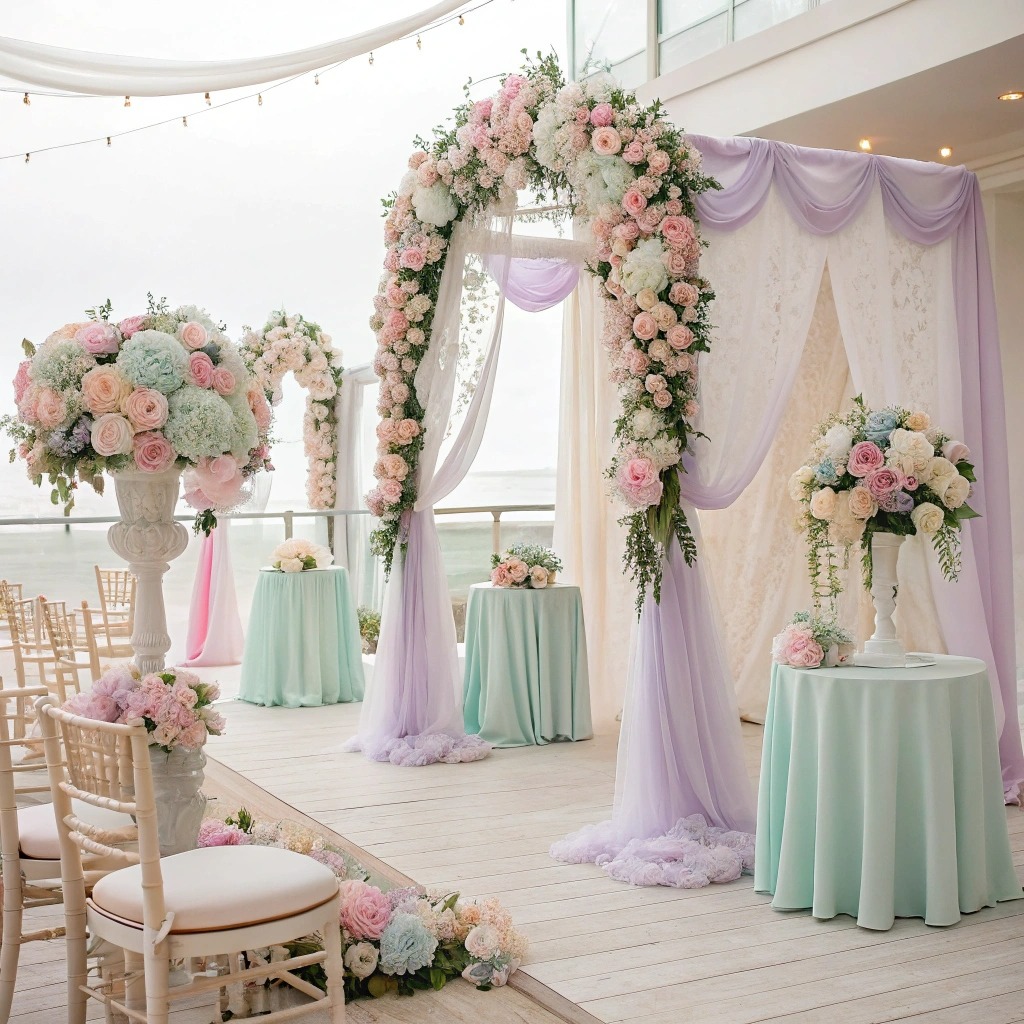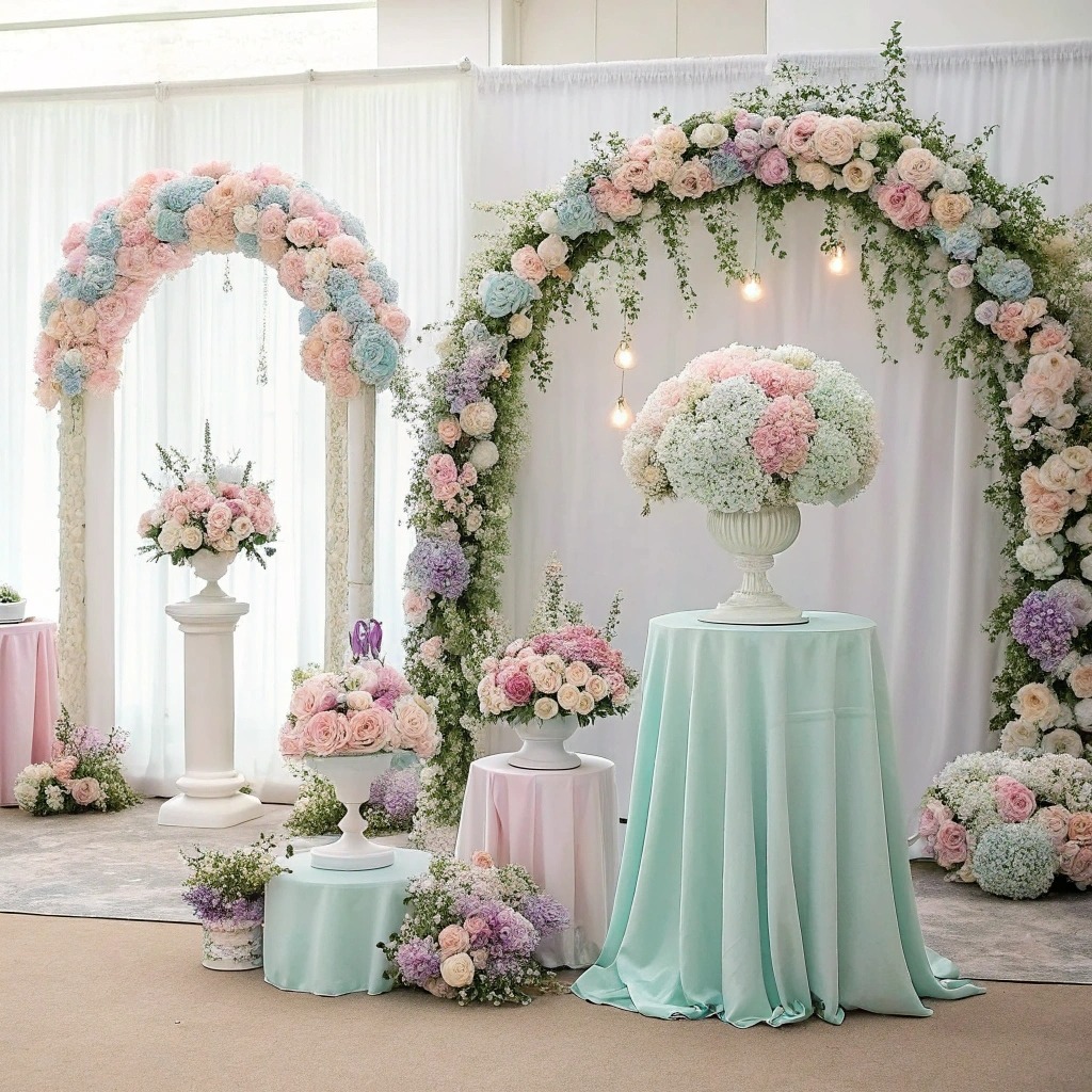 Найпопулярнішими квітами для весілля у пастельних тонах, що створюють ефект витонченості в весільному декорі, залишаються півонії, троянди garden rose, ранункулюси, еустоми та гортензії. Їхня природна форма й відтінки — пудрові, ніжно-рожеві, кремові — насичують простір ніжними акцентами. Всі ці аспекти передають настроєві палітри спокійного стилю. Вони ідеальні для витонченого декору весілля у пастельних тонах, особливо коли використані в ансамблі з лагідною зеленню або дрібною гіпсофілою.