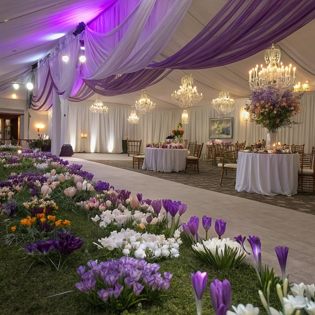 - Крокуси — відтінки білого, жовтого, фіолетового дозволяють створити живу, багатогранну палітру відтінків декору весілля з первоцвітів.