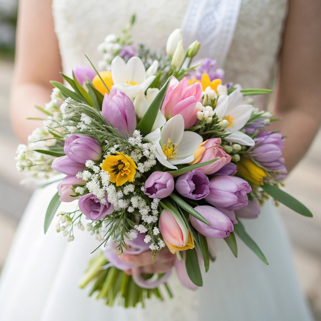 Чудовим вибором для декору весілля з первоцвітів у такого букета стануть конвалії, підсніжники, тюльпани, гіацинти, проліски. Вони створюють живу, але стриману композицію, яку можна доповнити польовими квітами або зеленню. Особливої уваги вартий колір: пастельні відтінки білого, блакитного, рожевого чи жовтого в поєднанні з легкими текстурами створюють чарівну атмосферу весни.