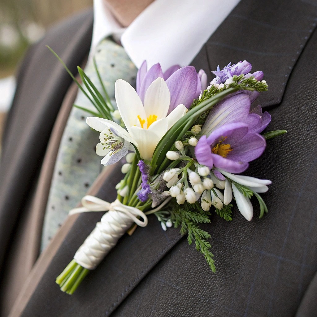 Бутоньєрка — це маленька, але значуща деталь образу нареченого та його свідків. У весільному декорі з первоцвітів бутоньєрки виглядають особливо витончено. Бутоньєрки у декорі весілля з первоцвітів можуть бути виконані з тих самих квітів, що й букет нареченої, або містити один виразний елемент — наприклад, підсніжник чи крокус.