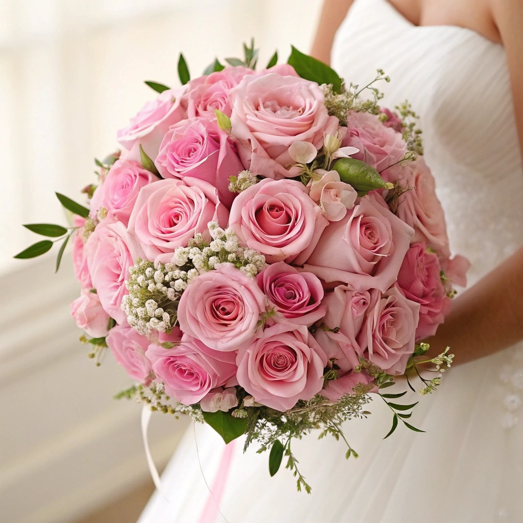 Рожеві троянди — це універсальний вибір для весільного букету, що поєднує елегантність і м’якість. Букет із рожевих троянд може бути ніжним пастельним, або ж насиченим, з глибоким рожевим відтінком. У весіллі в стилі «розкіш з трояндами» рожевий букет нерідко стає фокусною точкою образу нареченої — втіленням жіночності й тендітності.
