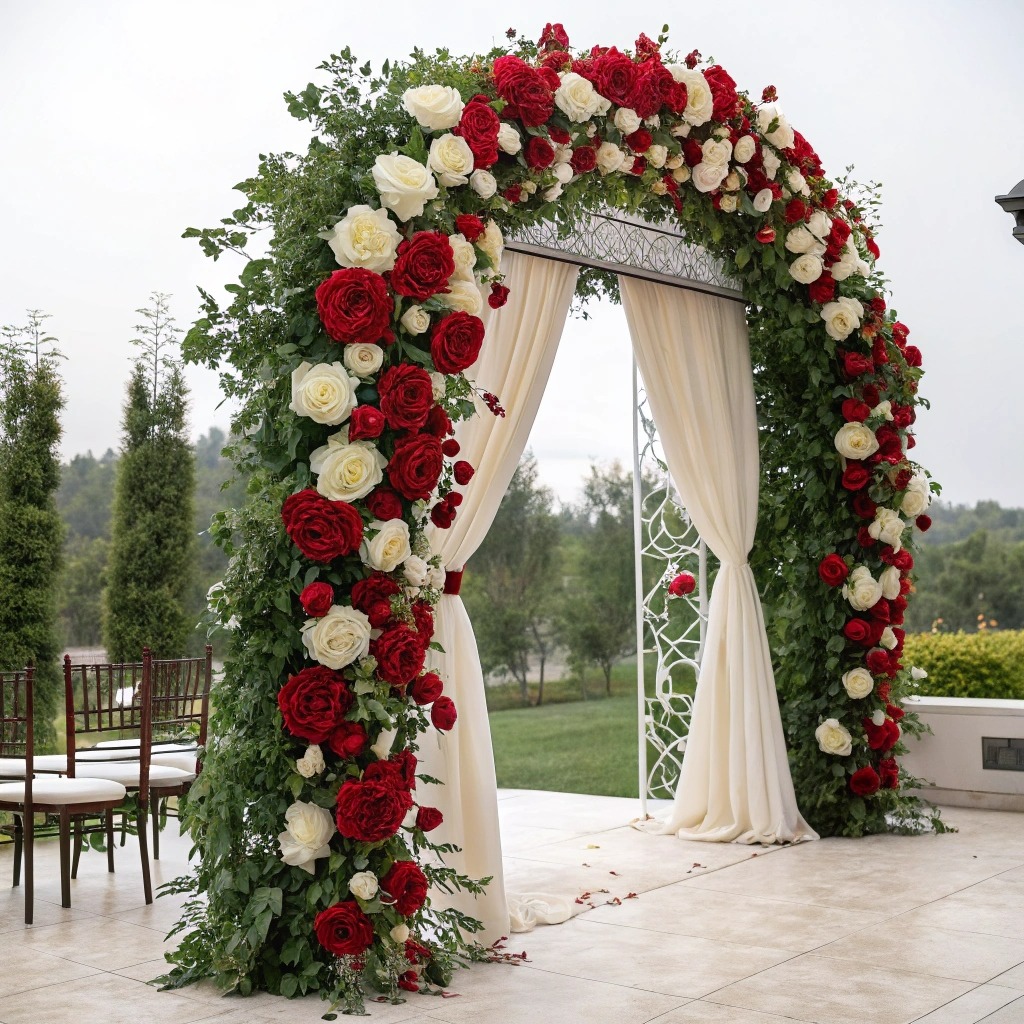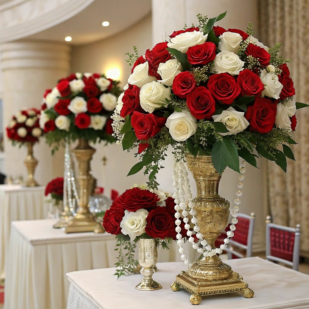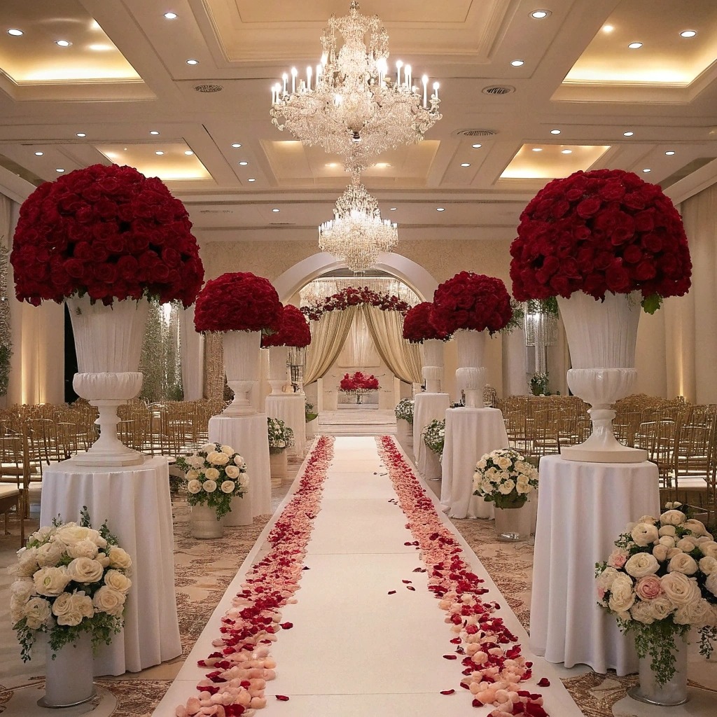 Церемонія на весілля в стилі «розкіш з трояндами» у червоних тонах може включати великі підвісні гірлянди, арки з живих квітів і романтичні флористичні композиції на кожному столі. Троянди можуть прикрасити стільці, серветки та навіть посуд — для цілісної концепції. Гармонійна кольорова гама підкреслює вишукані деталі для весілля та створює природну красу у святі.