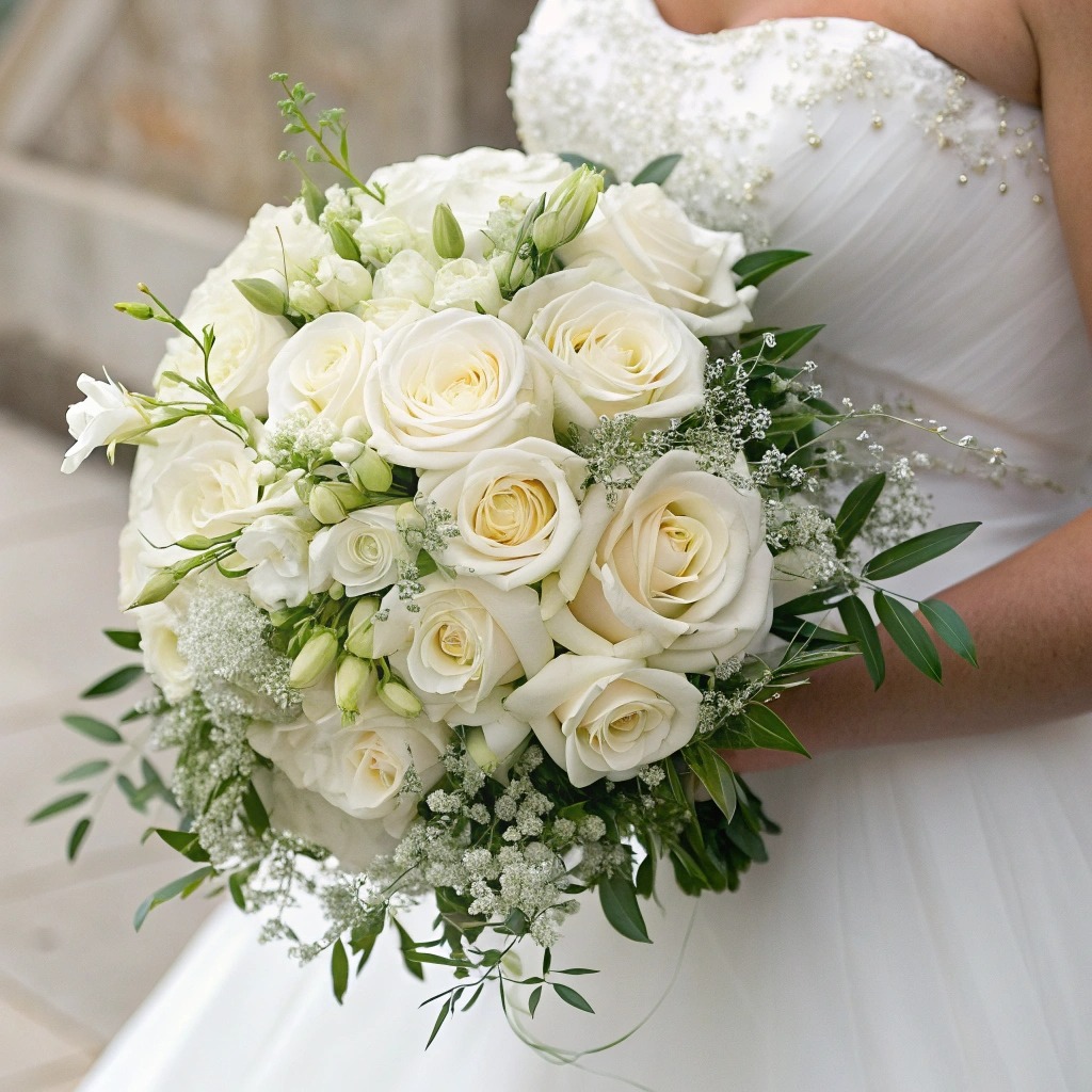Білий букет нареченої з троянд виглядає витончено і розкішно водночас. Він може мати стриманий класичний вигляд або бути доповнений зеленими гілками, ніжними акцентами з текстилю чи декоративними елементами. Весільна концепція з квітами у білому — це симфонія гармонії.