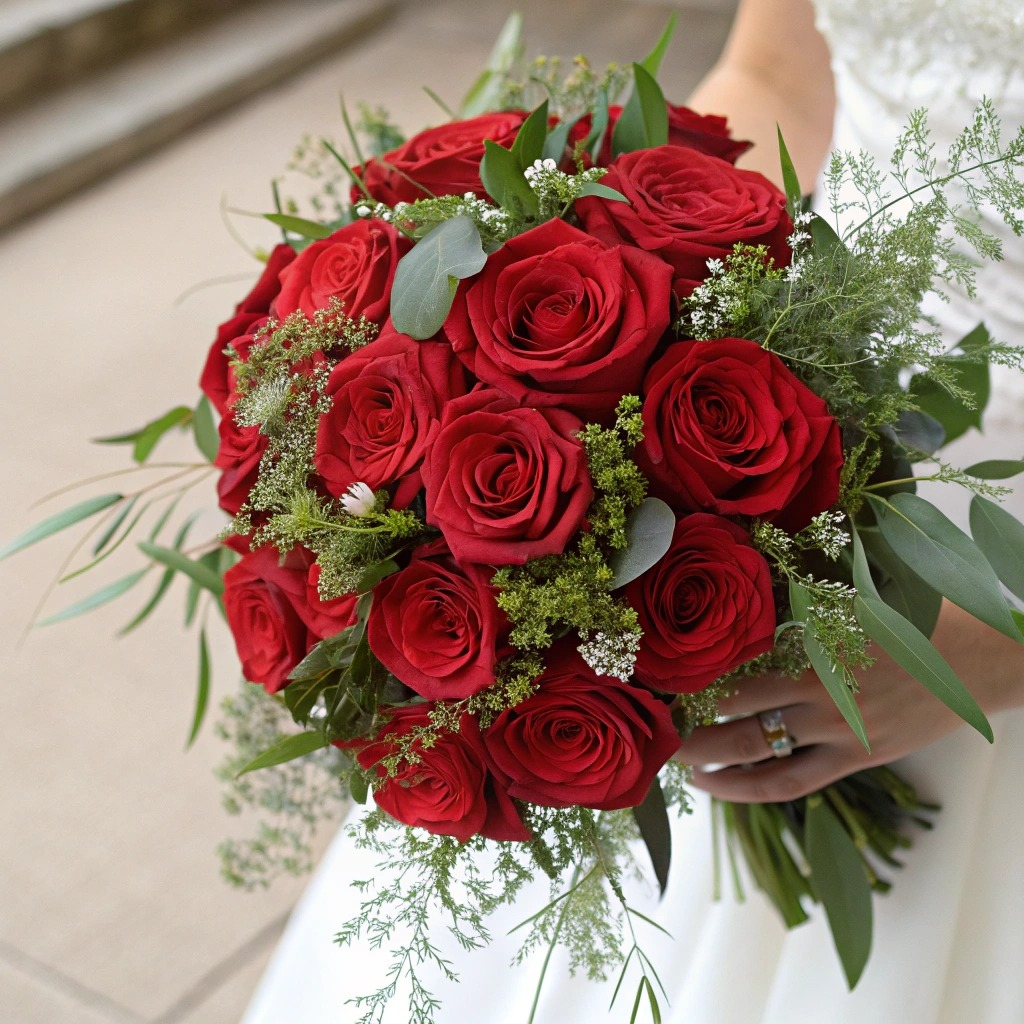 Букет з червоних троянд — це позачасова класика. Чудово пасує як до білосніжної сукні, так і до суконь у відтінках айворі, шампанського чи рожевого. Такий букет на весілля в стилі «розкіш з трояндами» додає вишуканості образу нареченої, підкреслює її стиль і підсилює атмосферу весільного торжества.