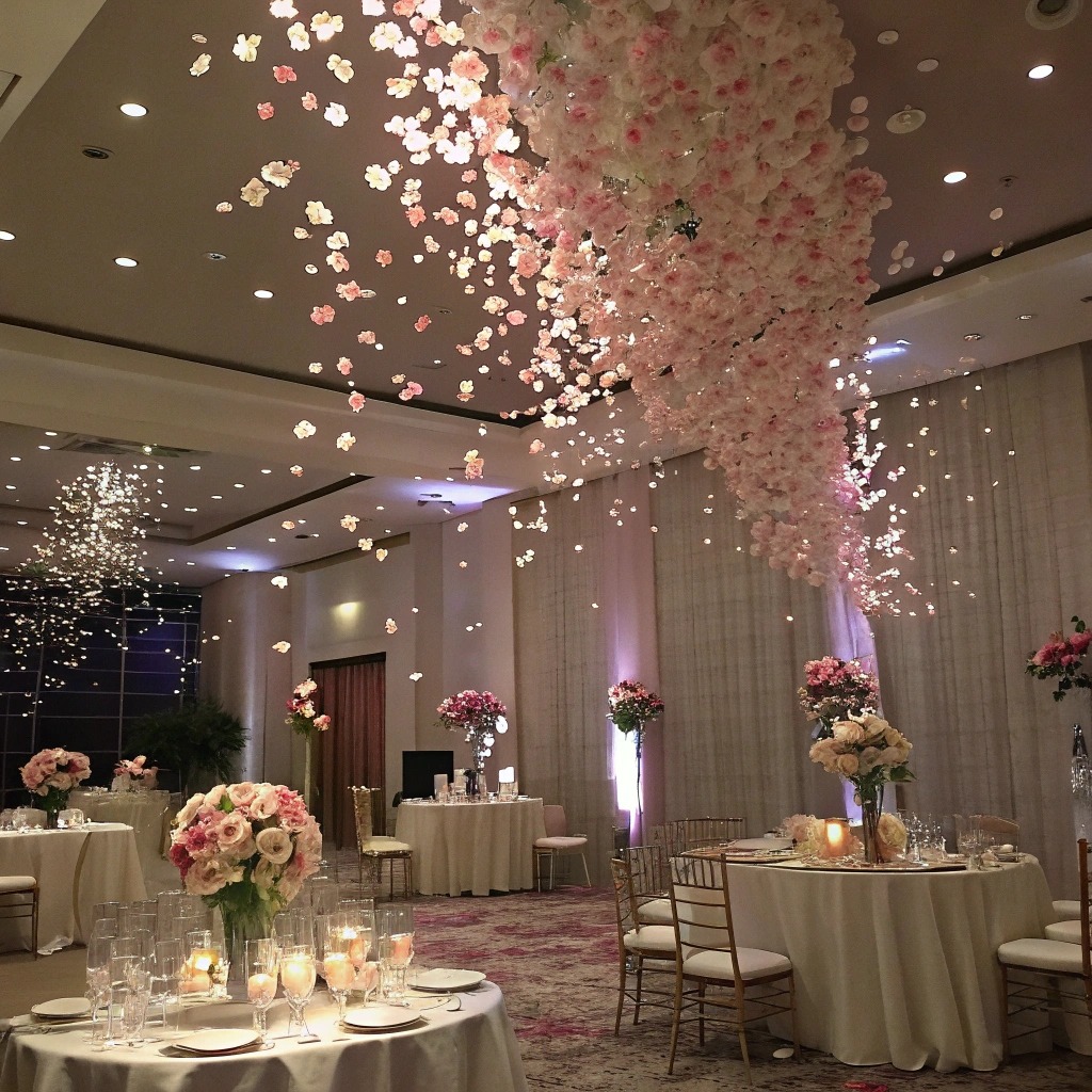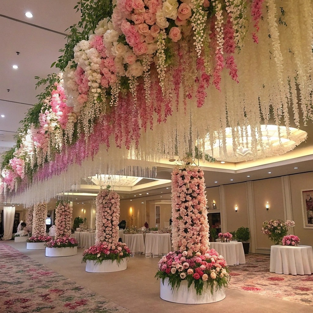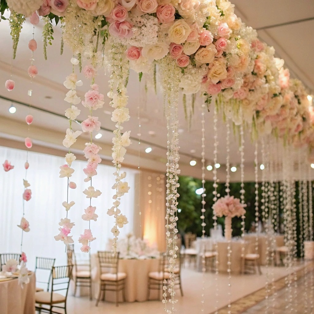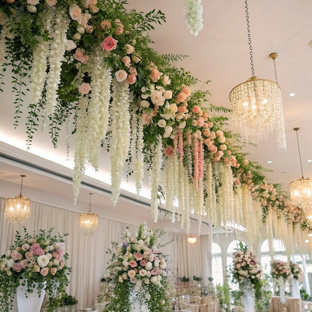 Найвиразніший ефект досягається тоді, коли декор весілля квітами на стелі стає центральним елементом композиції. Конструкції з підвісними гірляндами чи пелюстками можуть повністю змінити сприйняття простору. Це може бути суцільна квіткова стеля або окремі елементи, які створюють ніжний каскад. Для створення весільного декору із звичаючими квітами використовують арматуру, сітки, спеціальні підвісні системи — вони надійно тримають як живі, так і штучні квіти. Ефектні світлові акценти ще більше підкреслюють глибину й фактуру декору. Квіти можуть рухатися від найменшого руху повітря, що надає живості композиції й створює магію прямо над головами гостей.