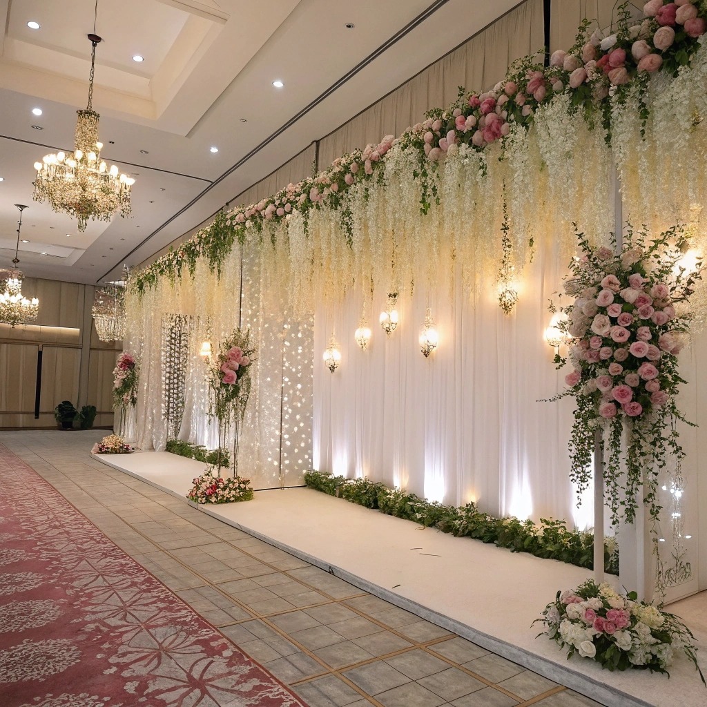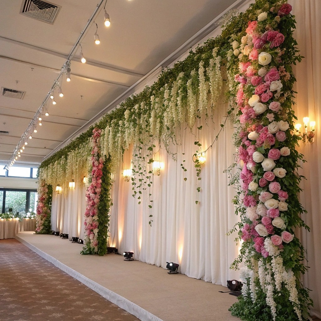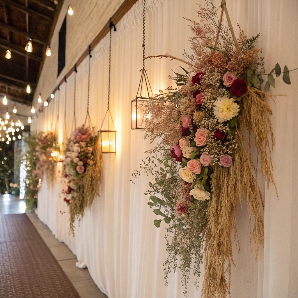 Коли мова йде про весільний декор у стилі “квітковий дощ”, стіни теж стають частиною казкового простору. Вони можуть бути оформлені вертикальними садами, композиціями з живих або сухих квітів, гірляндами, що спадають. Це не тільки красиво, але й функціонально — такі зони можуть зонувати простір або слугувати заднім планом для церемонії, танцювального майданчика, фотозони. Квіти на стінах створюють відчуття занурення в природу, навіть у закритих приміщеннях. Стиль оформлення весілля звисаючими квітами легко адаптується до кольорової гами весілля і дозволяє грати з формами — від геометричних до асиметричних рішень. Флористика у таких композиціях має бути максимально природною, щоби не втратити легкість та романтичну атмосферу.
